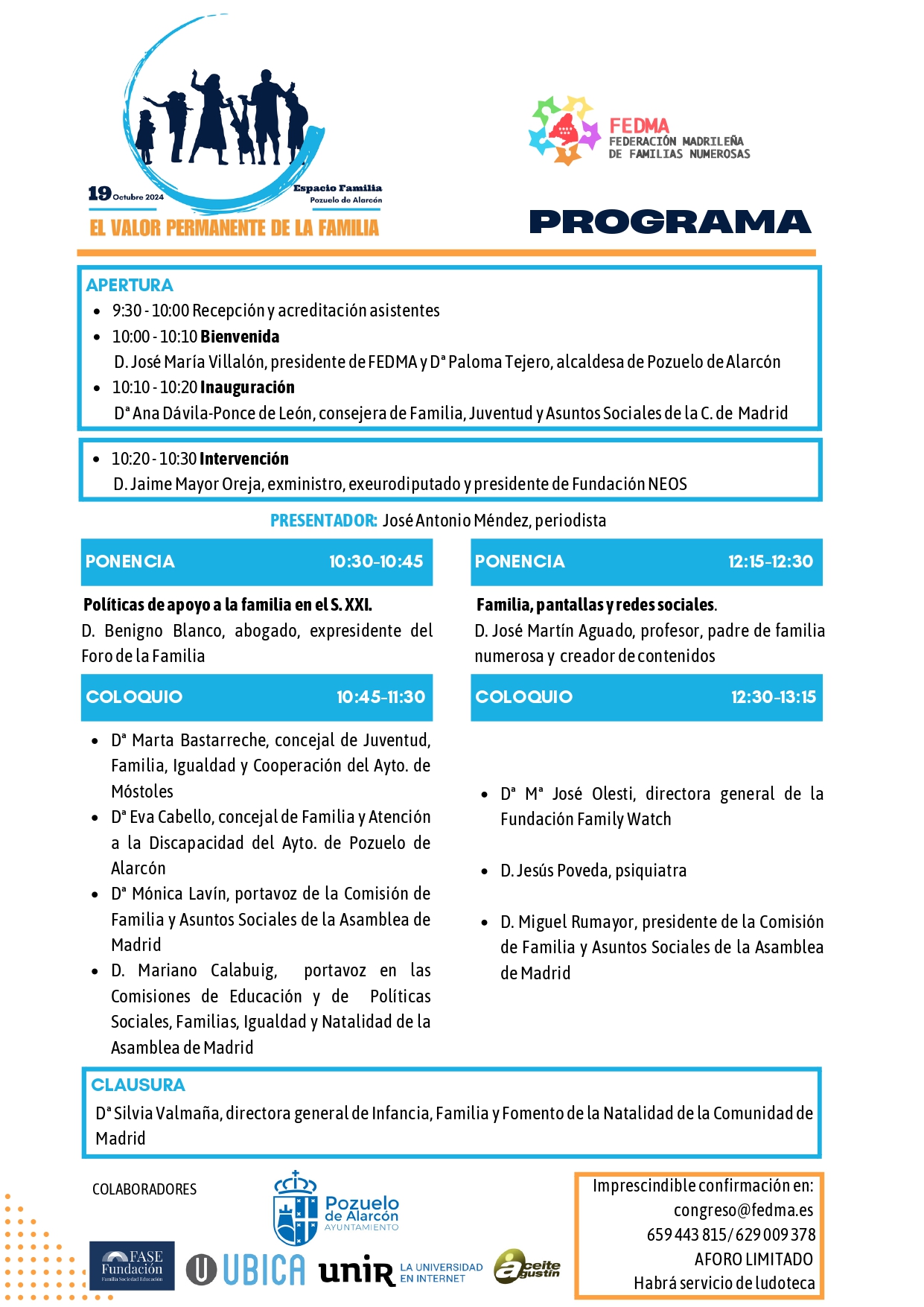 FEDMA organiza el III Congreso Federación Madrileña de Familias Numerosas que con el título: “El Valor permanente de la familia” tendrá lugar el próximo sábado 19 de octubre 2024 en el Espacio Familia del ayuntamiento de Pozuelo de Alarcón.