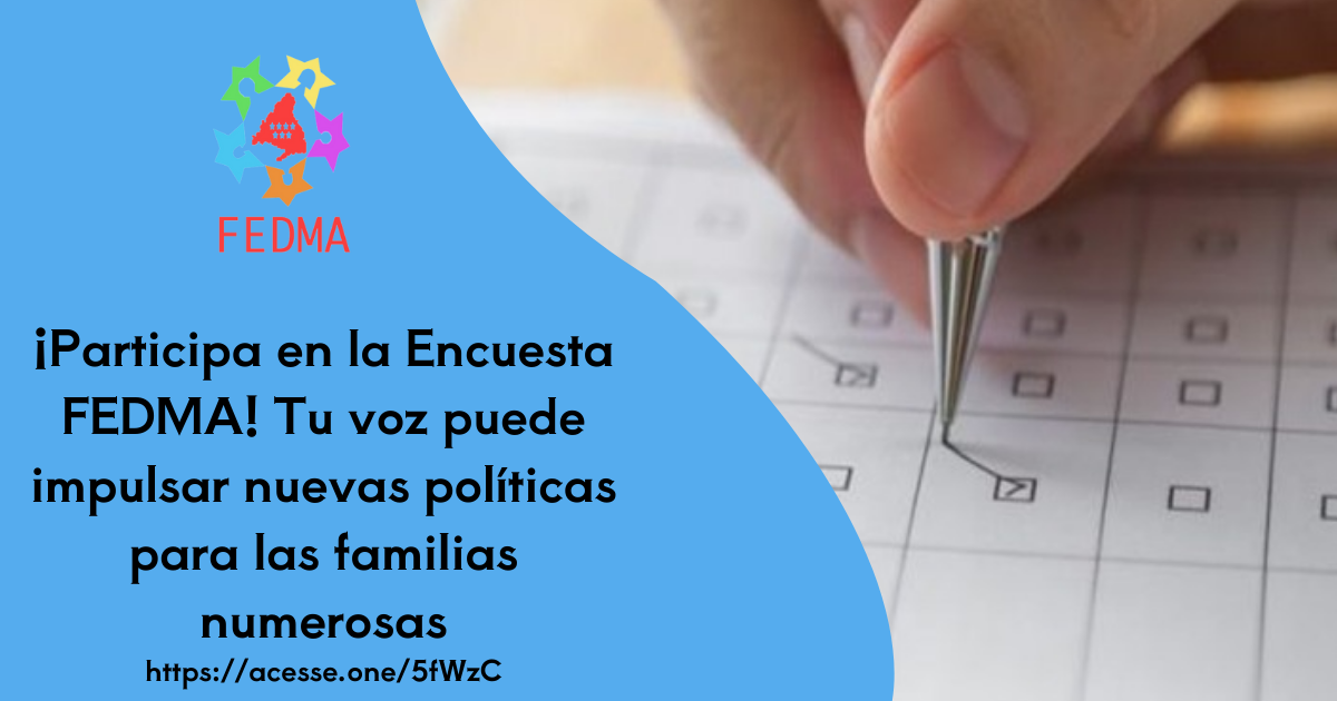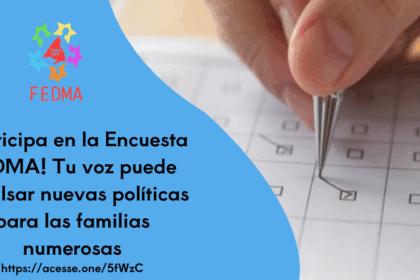 Desde la Federación Madrileña de Familias Numerosas (FEDMA) lanzamos una encuesta clave para recoger las necesidades reales de las familias numerosas y trasladarlas a las instituciones públicas. El objetivo es claro: que nuestra voz se escuche y se tenga en cuenta en el diseño e implementación de políticas públicas, normativas y planes de apoyo específicos.