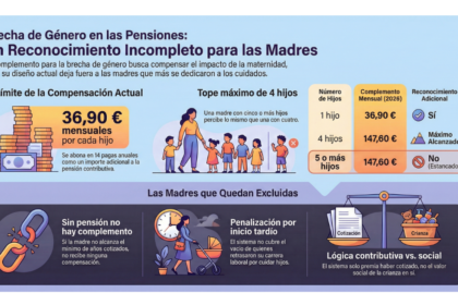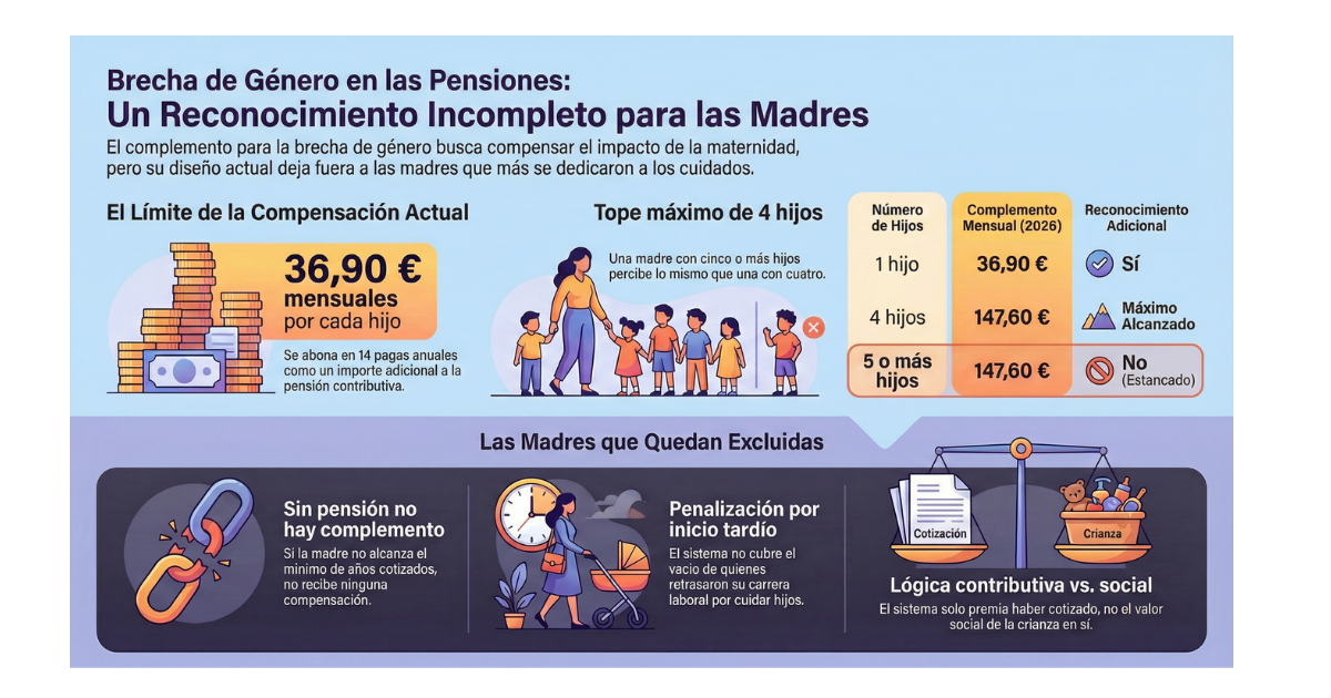 El complemento para la reducción de la brecha de género se presentó como una herramienta destinada a corregir el impacto que la maternidad ha tenido históricamente en las pensiones de las mujeres. Sin embargo, su configuración actual deja fuera situaciones especialmente relevantes desde la perspectiva de los cuidados: madres que se incorporaron más tarde al mercado laboral, madres que no han podido cotizar lo suficiente y, de forma muy directa, madres con más de cuatro hijos.
