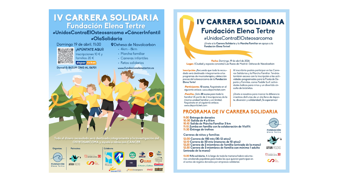 La Fundación Elena Tertre con la colaboración de la Asociación de Familias Numerosas de Las Rozas y del Club Atletismo Las Rozas, organizan la “IV Carrera Solidaria Fundación Elena Tertre”, que tendrá lugar el próximo domingo 19 de abril de 2026, a las 11:00 horas en la localidad de Las Rozas, (Madrid) con salida y meta en la Dehesa de Navalcarbón.